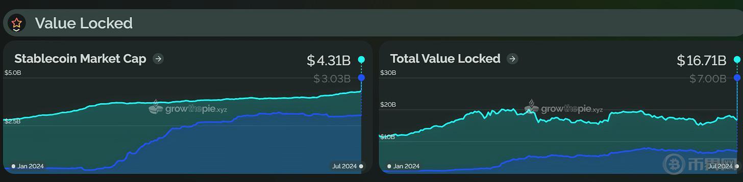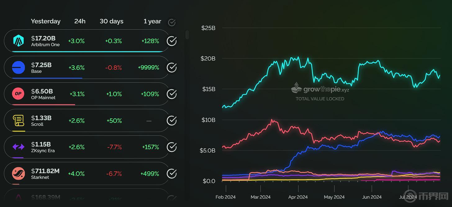 2024 年上半年,Layer2 生态系统总锁仓价值从 1 月底的约 228 亿美元增长至 429.7 亿美元,增幅约 88%。其中,Arbitrum、Optimism 和 Base 是主要贡献者。