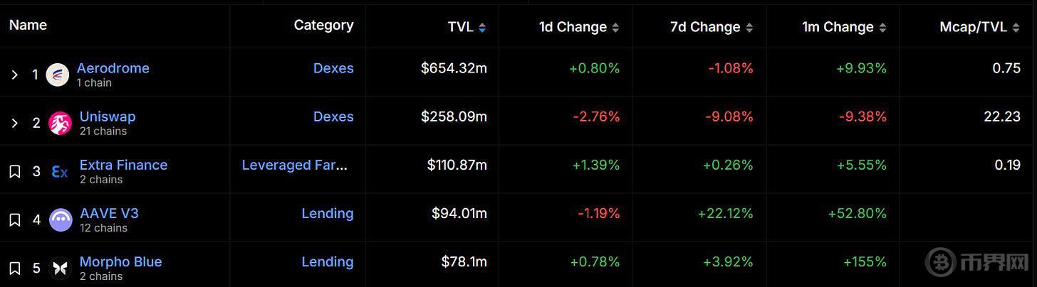 据 DefiLlama 数据,目前 Base 上 DeFi TVL 为 16.7 亿美元,其中原生 DeFi 项目占据主导地位,包括 Aerodrome(6.54 亿美元)和 Extra Finance(1.1 亿美元)。Aerodrome 是 Base 链上目前总锁仓价值最高的 dApp,领先排名第二的 Uniswap 一倍以上。