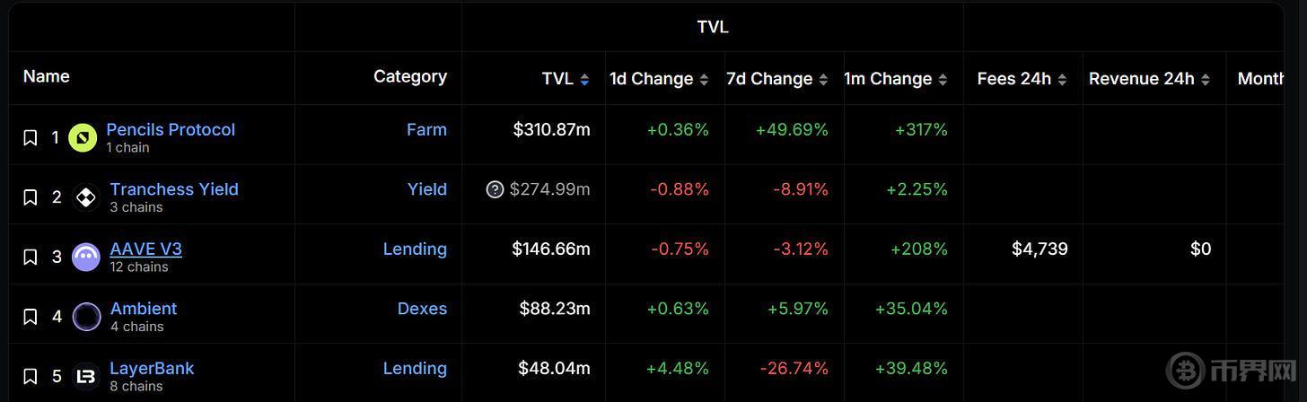 据 DeFiLlama 数据,Scroll 上总锁仓价值排名第一的项目是其生态原生项目 Pencils Protocol,锁仓价值为 3.1087 亿美元,过去一个月涨幅为 317%。值得注意的是,Scroll DeFi 总锁仓价值为 7.6902 亿美元,而其生态中排名前三的项目的总锁仓价值占据了超过 95% 的市场份额。