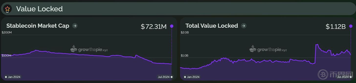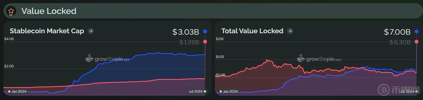 作为后起之秀,自 2024 年初以来,Base 一直保持着上涨趋势,并在 6 月赶超 Optimism,成为第二大 Layer2 。目前,Base 总锁仓价值约为 70 亿美元,较年初上涨约 716%。从下图可以看出,Base 在 3 月出现了一次明显的 TVL 增长,可能是由于 Farcaster 的持续增长、坎昆升级后 Gas 费用的降低以及 MEME 代币的流行,导致链上流动性大幅增加,推动了 TVL 的增长。不过,目前 Base 的 TVL 略有回落,较 6 月份下降了约 6.6%。