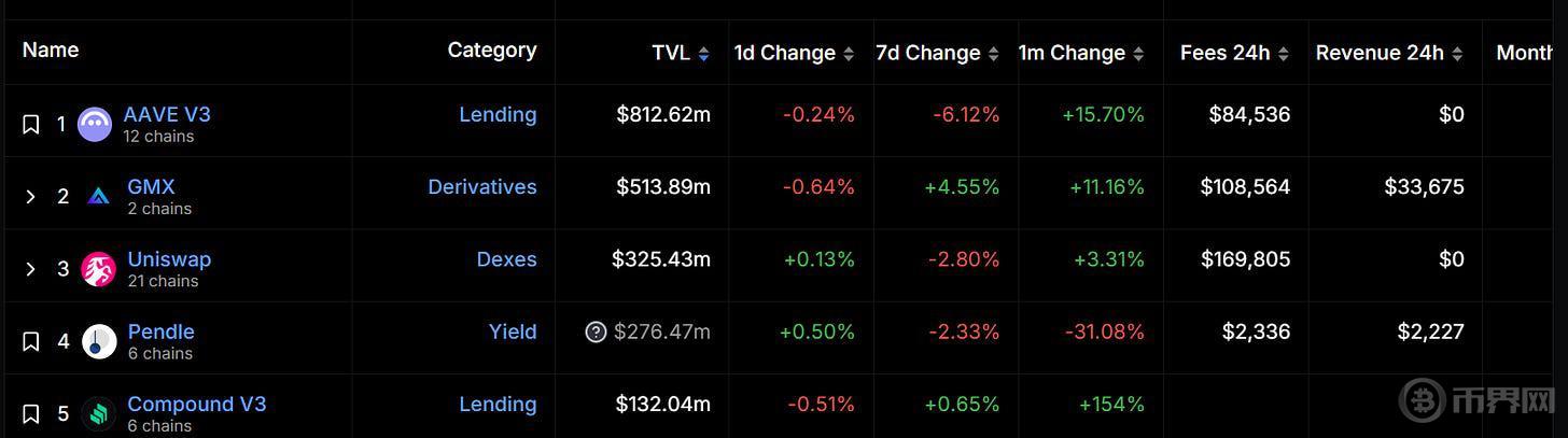 自 2024 年初以来,Arbitrum 总锁仓价值一直保持在领先水平。截至 7 月 28 日,Arbitrum 的 TVL 达到约 171.5 亿美元,稳居第一,占据约 40% 的市场份额,远超排名第二的 Base 2.4 倍多。据 DeFiLlama 数据,Arbitrum 上总锁仓价值最高的项目是 AAVE,锁仓价值为 8.1262 亿美元,其次是 GMX 和 Uniswap,分别为 5.1389 亿美元和 3.2543 亿美元。
