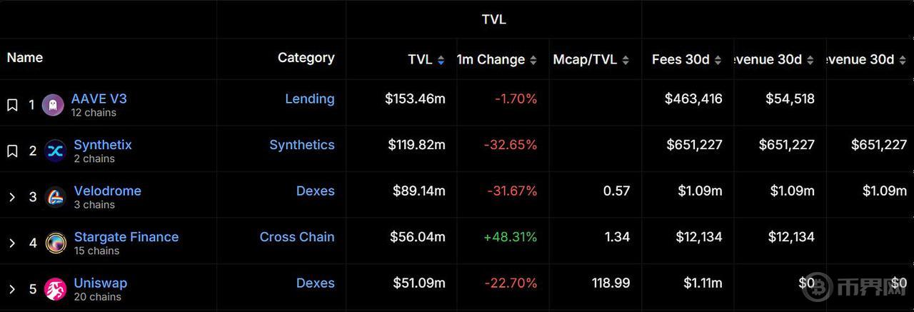 Optimsim 总锁仓量目前排名第三,其在 2024 年 3 月 10 日达到上半年历史高点,随后略有回落,但整体较为平稳,最终于 6 月被 Base 反超。据 DeFiLlama 数据显示,Optimism 生态 TVL 排名前三的项目分别为 AAVE v3、Synthetix 及 Velodrome。但在过去一个月内,这些项目的 TVL 都呈现下降趋势。