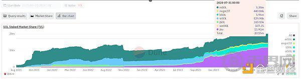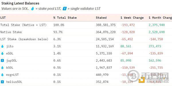 SOL质押量:截至7月30日数据,共计质押量为3.88亿枚SOL,月内增长0.6%,其中LST协议锁住的量只占比6.3%,约2000万枚。