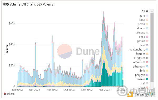 近日Solana链上DEX在过去30天交易量再次超越以太坊,用户交易Meme热情居高不下,目前龙头Meme的日交易量都超过了5000万美元。从BONK、WIF开始,Solana掀起了一场Meme狂潮,2023年12月,Solana上的Bonk开启了疯狂的涨势,拉动了整个Sol生态的Meme爆发;2024年2月,帽子狗也在Sol上掀起了一轮热潮;到3月,BOME开启新一轮“打钱概念”Meme;再到后来Pump.fun平台的丝滑一键发币,金狗频出。