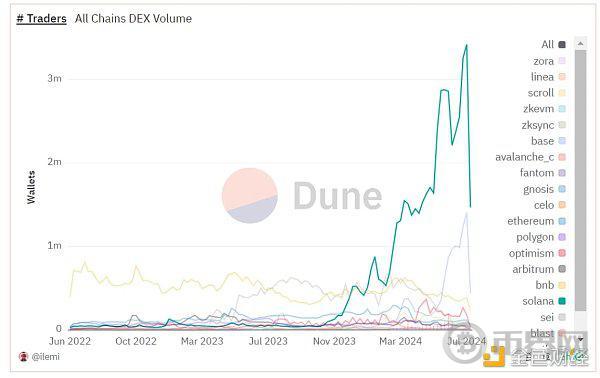 网络活动也保持着高水准,DEX周交易人数在7月一度超过300万人,在各公链中遥遥领先。