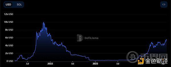 TVL:Defillama数据显示,Solana TVL为54亿美元,仅次于以太坊和Tron,相比21年11月的顶部100亿美元还有近一倍的上涨空间,不过可以看到TVL在今年明显的稳步上涨,未来可期。