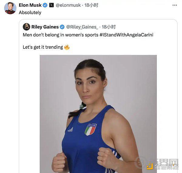 该事件在全网讨论都非常多,涉及体育公平性和跨性别权利的争议,许多知名人物都针对此事件进行发生。比如特朗普表示当选后将禁止男运动员参加女子比赛;马斯克在 18 小时前也社交媒体转发了「Men don't belong in women's sports #IStandWithAngelaCarini」的推特。