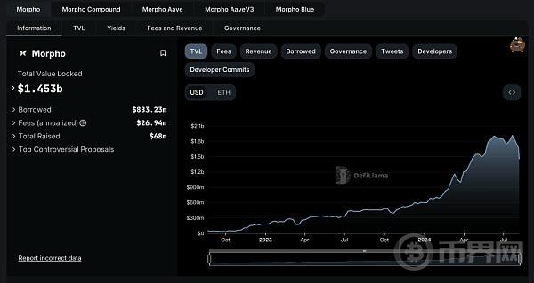 根据DeFiLlama数据,Morpho的总锁仓量 (TVL)已达到了14亿美元,借款量 (Borrowed)也有8亿8千万多美元,总融资更是达到了6800万美元。