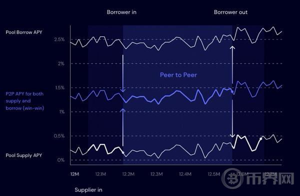 所以,无论用户是直接使用 Morpho,或是将资产存入 compound 后获得的 cToken 存入 Morpho,其都是可以正常获得贷方 APY 的。同样的,当匹配到借款人后,二者都将获得改进后的 P2P APY,该 APY 高于贷方 APY,同时又低于借方 APY,这对双方都是更好的激励。