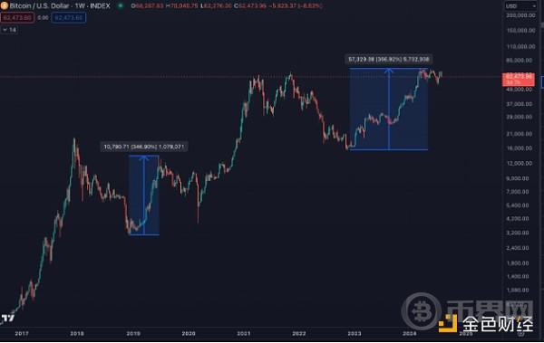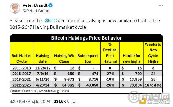 这位分析师在 8 月 5 日的 X 帖子中表示,“减半以来的 BTC 下跌趋势现在与 2015-2017 年减半牛市周期的下跌趋势相似。”