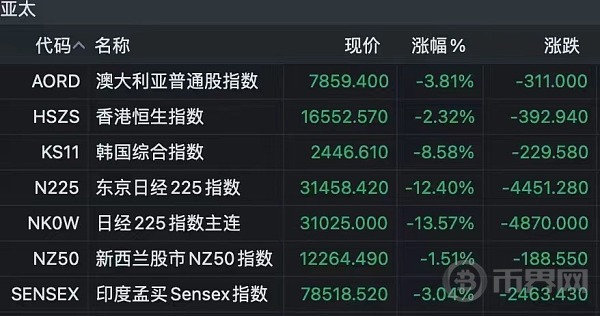 2. 日经 225 指数收跌 12%,盘中曾暴跌 15%;东证指数收跌 13%,二者均一度触发二次停牌。日经 225 波动率指数涨幅扩大至 132%,创下单日涨幅新高。