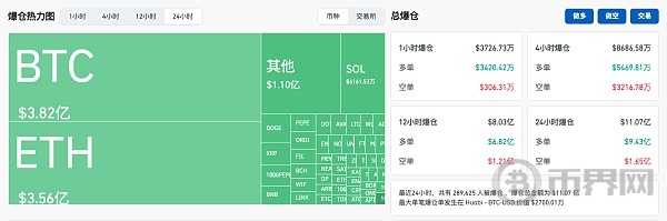 据 Coingalss 数据显示,截至撰写本文时,过去24小时加密货币市场爆仓量已超11亿美元,其中比特币爆仓量达3.82亿美元,以太坊爆仓量达3.56亿美元。总计近 29 万人的仓位被市场无情抹除,其中单笔最大爆仓发生在Huobi,总计价值2700万美元的比特币币本位合约仓位被强制清算。