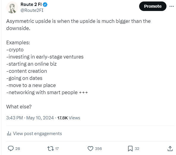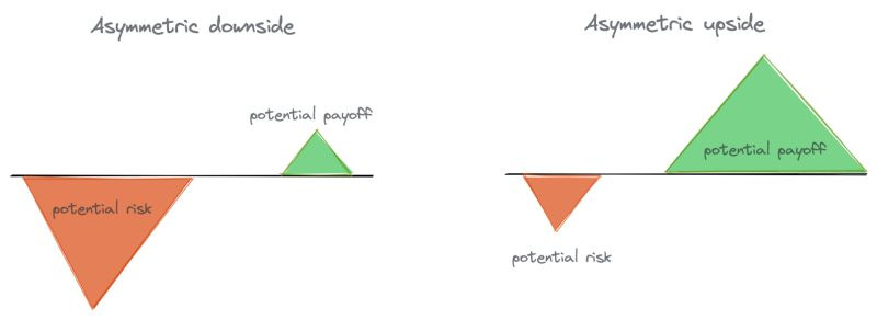 不对称上行赌注是指如果您赢了,上行收益会为您带来 10 到 100 倍的净收益,但是如果您输了,您只会损失很少。