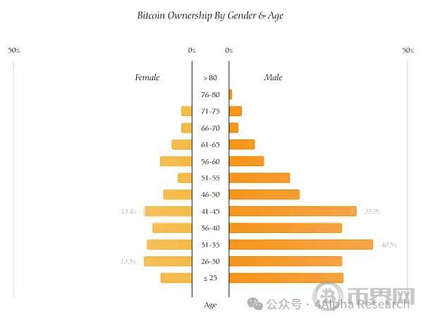 下图展示了按性别和年龄划分的比特币持有者比例。而从 Block 的一项调查中发现,这种性别上的不平衡现象在国际样本中不太明显,仅在美国的研究中表现得较为突出。