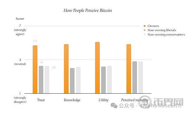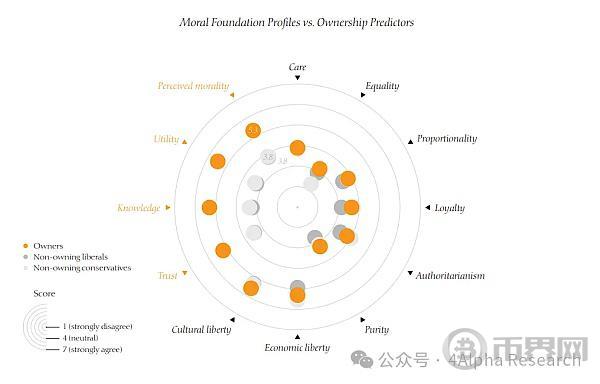 比特币持有者的价值观:调查使用道德基础理论(Moral Foundations Theory)来分析比特币持有者的价值观和身份认同。结果显示,比特币持有情况与特定的道德基础没有明显相关性。相比之下,比特币持有更多地受到对比特币概念的理解、对其协议和资产的认可,以及对比特币的道德感知的影响。