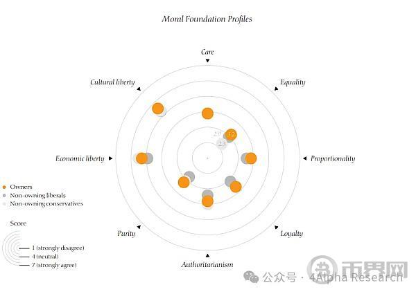 值得注意的是,比特币持有者呈现出一个独特的特征,即更加关注文化自由和平等;在圣洁和忠诚上与保守派相当,在关爱上与自由派相当,而在经济自由和权威主义上则处于自由派和保守派之间。