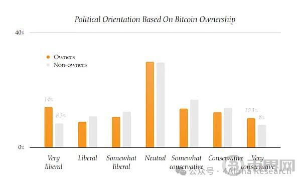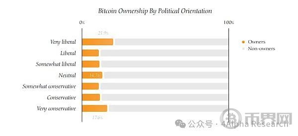 从政治角度看,比特币持有者与非持有者没有显著差异。尽管比特币自问世以来一直受到各政治派别的批评,近年来尤其受到政治左翼的攻击,而其最坚定的支持者往往是共和党人和自由意志主义者,这使得许多人误以为比特币是一种右翼或自由意志主义现象。结果是,许多人认为民主党人或自称自由派的人不太可能拥有比特币。