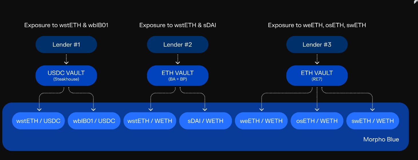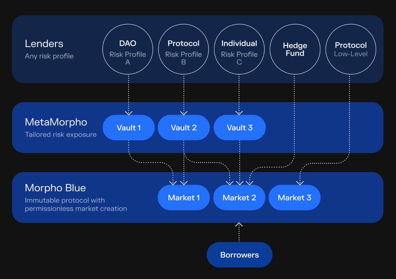 为提升借贷效率和简化用户体验,Morpho Blue 只专注于贷款业务,而建立在其之上构建的 MetaMorpho 实现无需许可的市场创建和无需许可的风险管理。