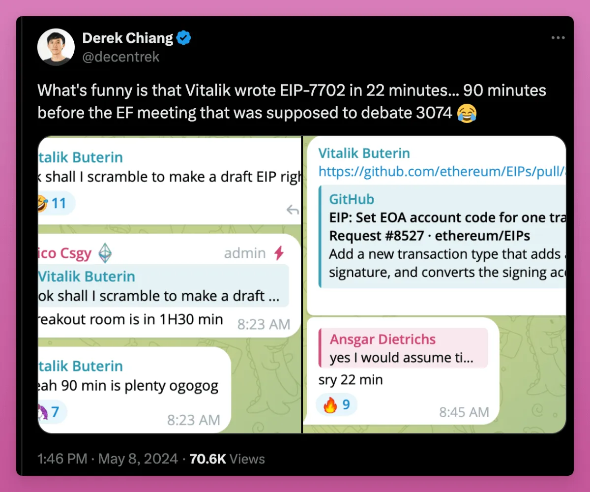 注意:Vitalik 在 22 分钟内编写的 EIP-7702 被优先考虑,EIP-7702 也与账户抽象的未来实现兼容。