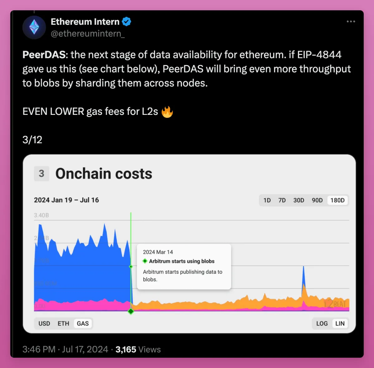 与之前 Dencun 升级中的 Proto-Danksharding 一样,PeerDAS 将进一步降低 L2 交易费用。但我找不到它能便宜多少的具体数字。0xBreadguy 提到 Pectra 将把 blob 容量扩大 2 到 3 倍。