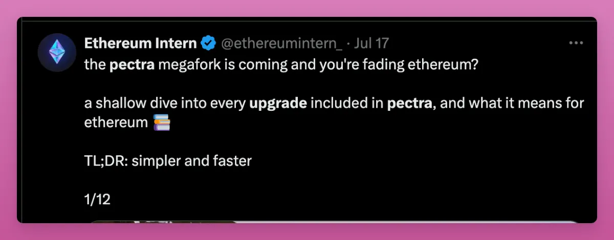 我明白原因所在。以太坊发生了重大变化:从 PoW 迁移到 PoS、ETH 销毁启动和 EIP-4884 等。然而 Pectra 有一些很酷的升级。