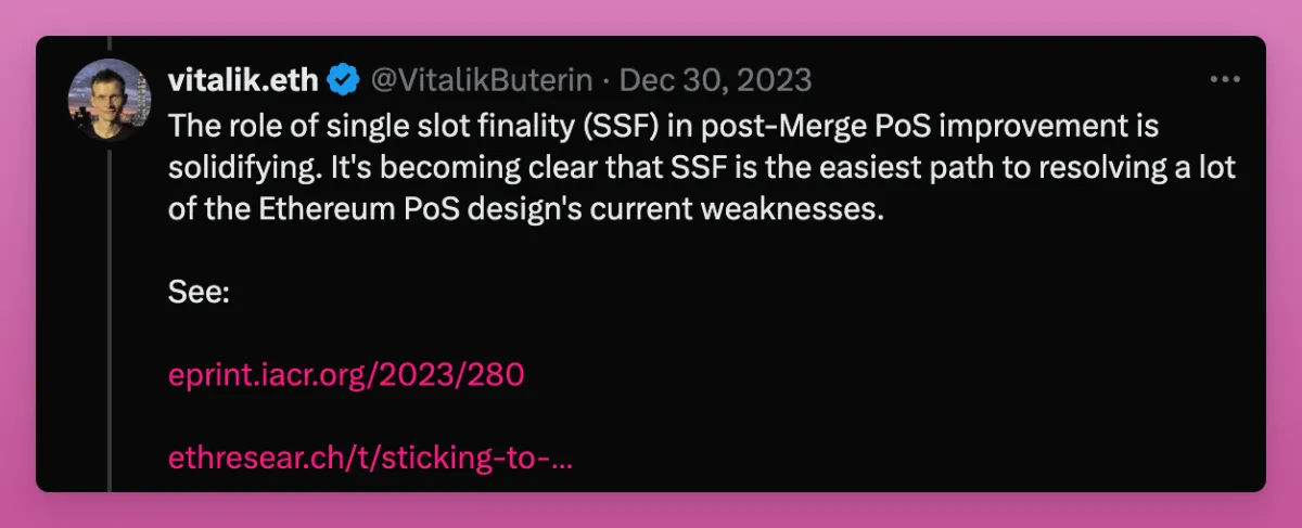 Vitalik 在 2023 年 12 月提到,SSF 是解决以太坊 PoS 设计中大多数缺陷的最简单方法。