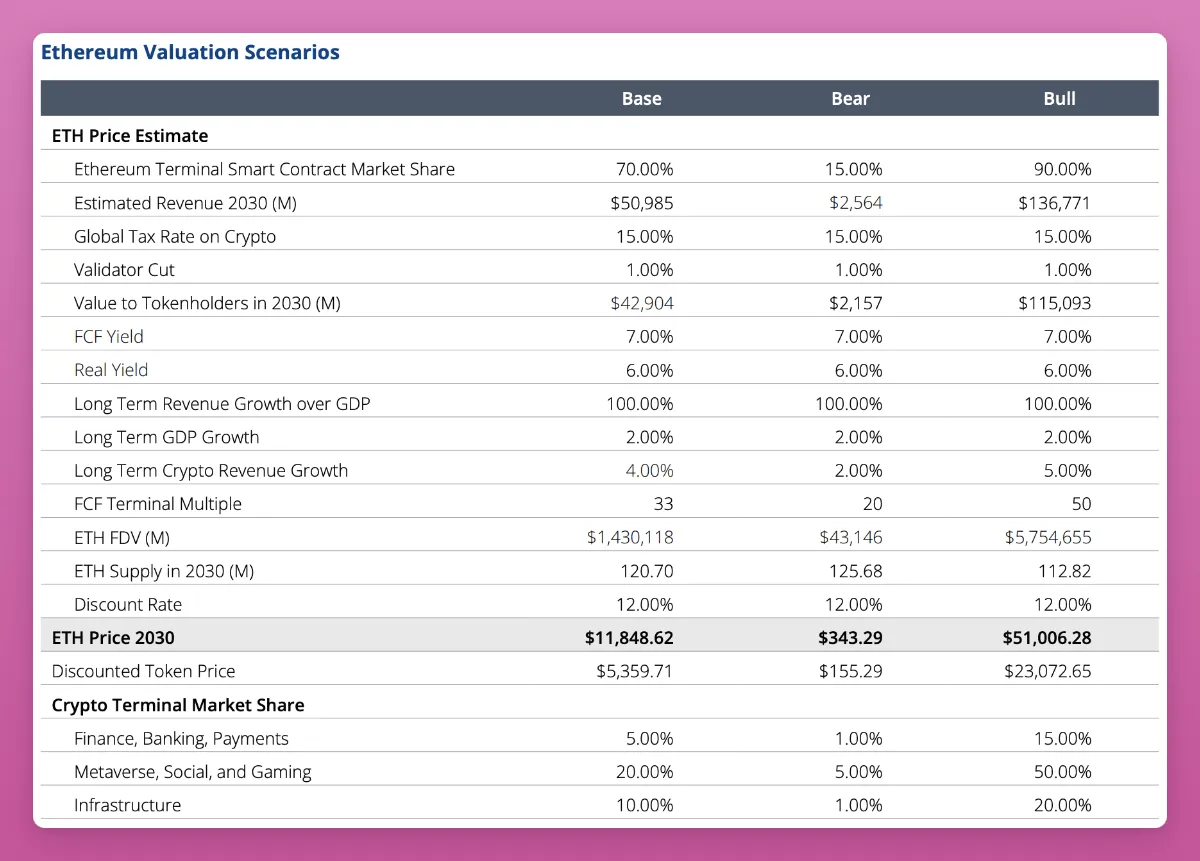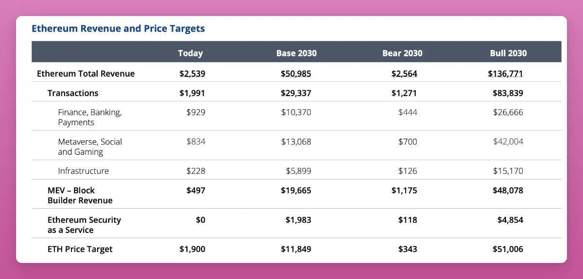 不过,我对 ETH 达到 5.1 万美元的看涨前景更为兴奋。VanEck 的 ETH 价格预测基于: