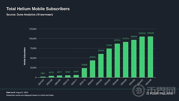 Helium 是一个 5G 无线网络 DePIN,已迁移至 Solana。使用 Helium 物联网设备热点的用户以 HNT 支付网络费用,然后将费用分配给热点运营商。Helium 的网络适用于各种设备,去年,Helium Mobile 推出了每月 20 美元的电信服务项目,可在全美范围内提供无限数据、通话和短信服务。