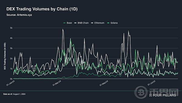 2024 年,Solana 在金融领域的几个垂直赛道中有着显著的增长。比如 DEX,其交易量全年保持高位,有时甚至可与以太坊相媲美。