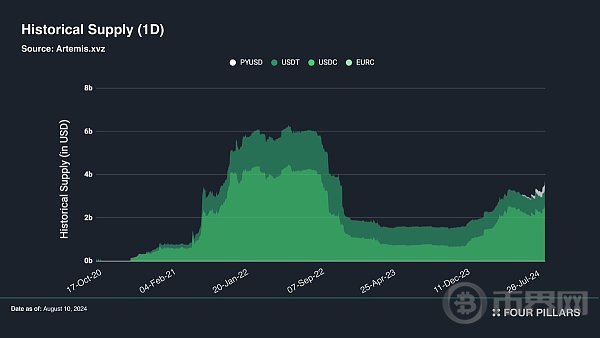 Solana 金融领域的另一个积极迹象是稳定币市值的稳步增长。Solana 生态稳定币市值从 2024 年 1 月 1 日的约 18.9 亿美元增长到 2024 年 8 月 10 日的 38 亿美元,增长了一倍多,总市值增加了约 19.1 亿美元。
