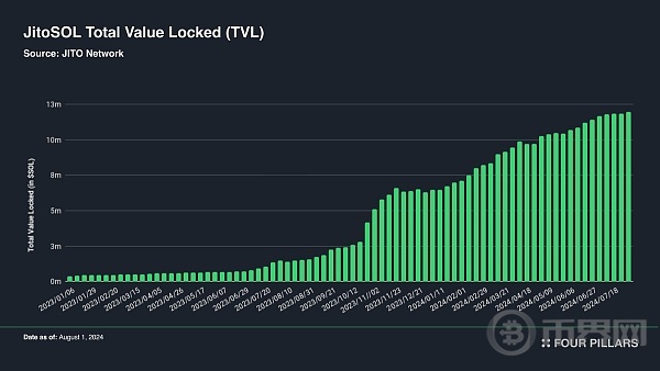 JITO 是一个流动性质押(LST)协议,它将最大可提取价值(MEV)整合到其质押机制中,与持有者分享收益。 2024 年,JITO 在 LST 领域的市场份额迅速增长,目前是 Solana 生态中最大的 LST 协议,TVL 超过 1200 万 SOL。