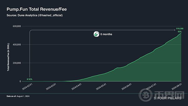 最后,今年 Solana 生态金融赛道中最重要的成功案例之一可能是 Pump.Fun,它是 Solana 上的一个 memecoin 发行平台,抓住了大量投机需求。自 2024 年 1 月推出以来,Pump.Fun 已迅速成长为所有区块链生态中费用和收入排名前十的协议之一。在大约六个月的时间里,Pump.Fun 平台产生的总收入/费用从 2024 年 2 月 2 日的 8 SOL 暴增至 2024 年 8 月 1 日的 518,366 SOL。