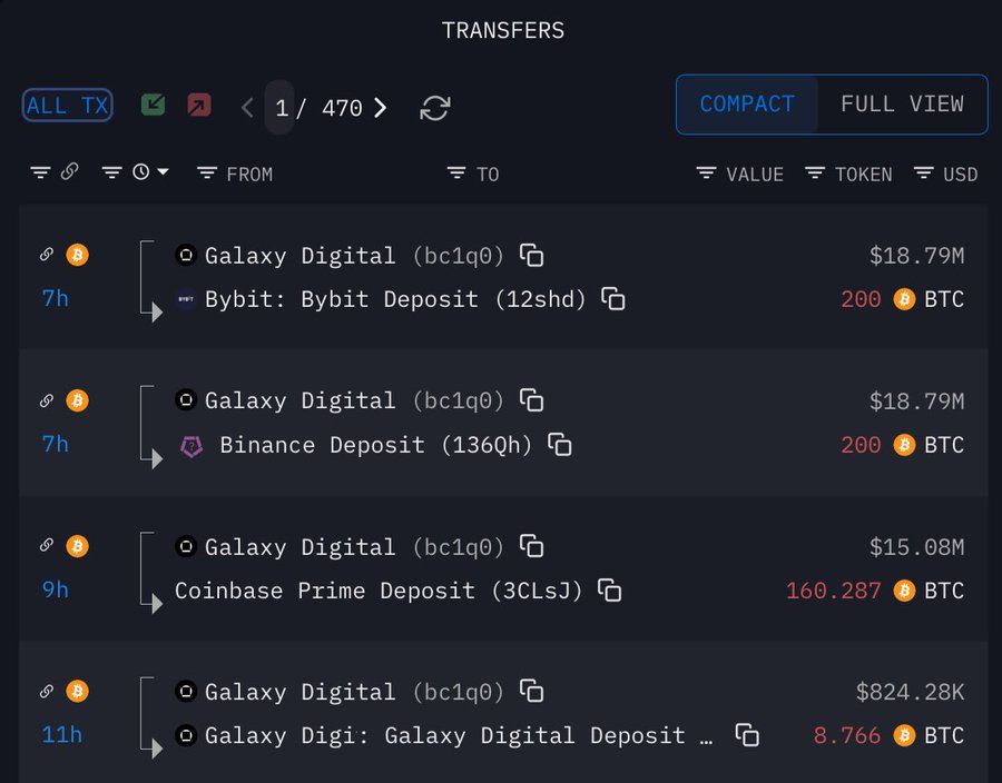根据Darkfost分析,Galaxy Digital转移的部分比特币已流入币安、Bybit和Coinbase等主流中心化交易所。值得注意的是,单日内即有约560枚BTC(价值近5,000万美元)转入交易所。从链上视角看,这类移动意义重大——转入交易所通常意味着代币可能被用于出售、对冲或提供流动性。