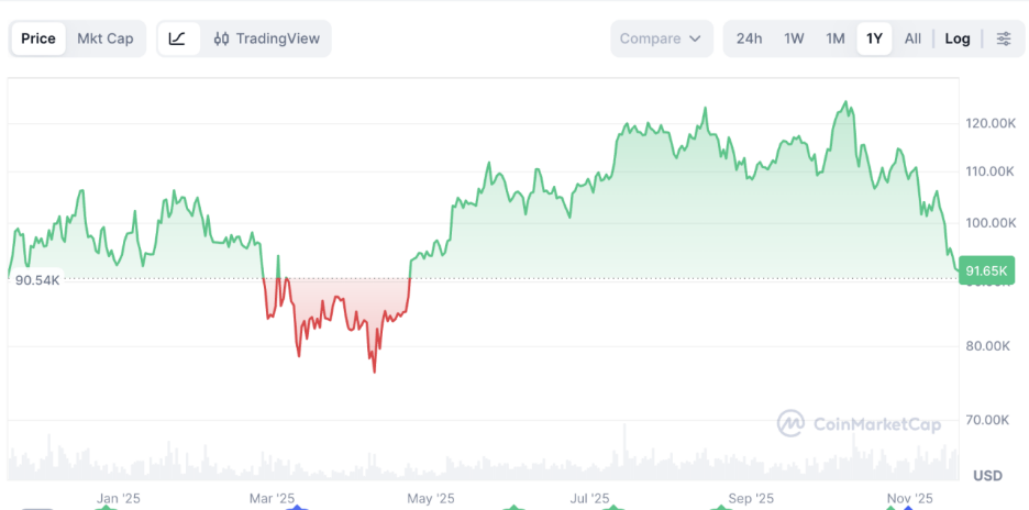 在过去数周的市场剧震中,比特币的价格和情绪出现了罕见的巨大背离:价格仍然稳稳维持在 9 万美元上方的历史高位区间,但市场心理却已坠入“极端恐惧”的深渊。恐惧与贪婪指数一度触及 16 点,这是自 2020 年 3 月全球疫情崩盘以来最寒冷的情绪读数,即便近期略有修复,也仅在 12–18 区间挣扎。社交媒体对比特币的正面叙事同步滑落,从此前的坚定乐观迅速转向抱怨、愤怒与互相甩锅。这样的错位并不是偶然,它往往出现在牛市中后段:早期入场的玩家早已积累巨大浮盈,一旦宏观出现风吹草动便选择落袋为安;而后期追高的资金在短期震荡中被迅速套牢,浮亏情绪进一步放大了市场的恐慌与失望。比特币当前约 9.2万美元,和年初(约 90,500 美元)几乎持平,全年经历大幅上冲与深度回调后又回到起点附近,呈现“高位震荡原地踏步”的行情。