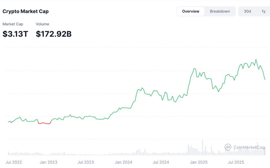 链上资金流向提供了比情绪更直接的信号。首先,现货 ETF 的角色从驱动牛市的“增压引擎”变成了短期的“排水管”。11 月以来,ETF 录得超过 20 亿美元的累计净流出,单日最大流出更是接近 8.7 亿美元,刷新上市以来的最差纪录。叙事层面的冲击远大于资金本身:此前“机构长期配置”的逻辑是市场最核心的支撑点,如今这一支撑转向减仓,让散户感受到“没有大人兜底”的不安全感。巨鲸行为也呈现出明显的分化。持有 10–1000 BTC 的中等体量巨鲸在过去几周持续成为净卖家,卖出数万枚比特币,明显是布局较早、利润丰厚的老玩家选择兑现。而体量超过 1 万 BTC 的超级巨鲸则在同步增持,链上数据显示部分长期战略实体在下跌中逆势吸筹,规模达到上万枚 BTC。与此同时,小体量散户(≤10 BTC)的净流入也在缓慢上升,这说明虽然最情绪化的小白用户可能在恐慌中砍仓,但另一部分更有经验的长线散户正在把握机会加仓。链上已实现亏损指标更是出现了过去半年中最大的一天亏损记录,大量筹码在亏损中被迫卖出,典型的“投降式抛售”信号清晰浮现。综合各种链上指标,我们看到的不是市场全面撤离,而是筹码的快速再分配——从短期、情绪化资金向资金耐心更长、风险承受能力更强的主体集中,这是历次大牛市中后段都会出现的结构性现象。目前市场处于牛市后半段的高位震荡期——市值虽然回调但仍在强势平台,情绪却大幅降温,结构性分化加剧,优质资产抗跌,但投机性资产持续出清。加密市场整体市值呈下降趋势。
