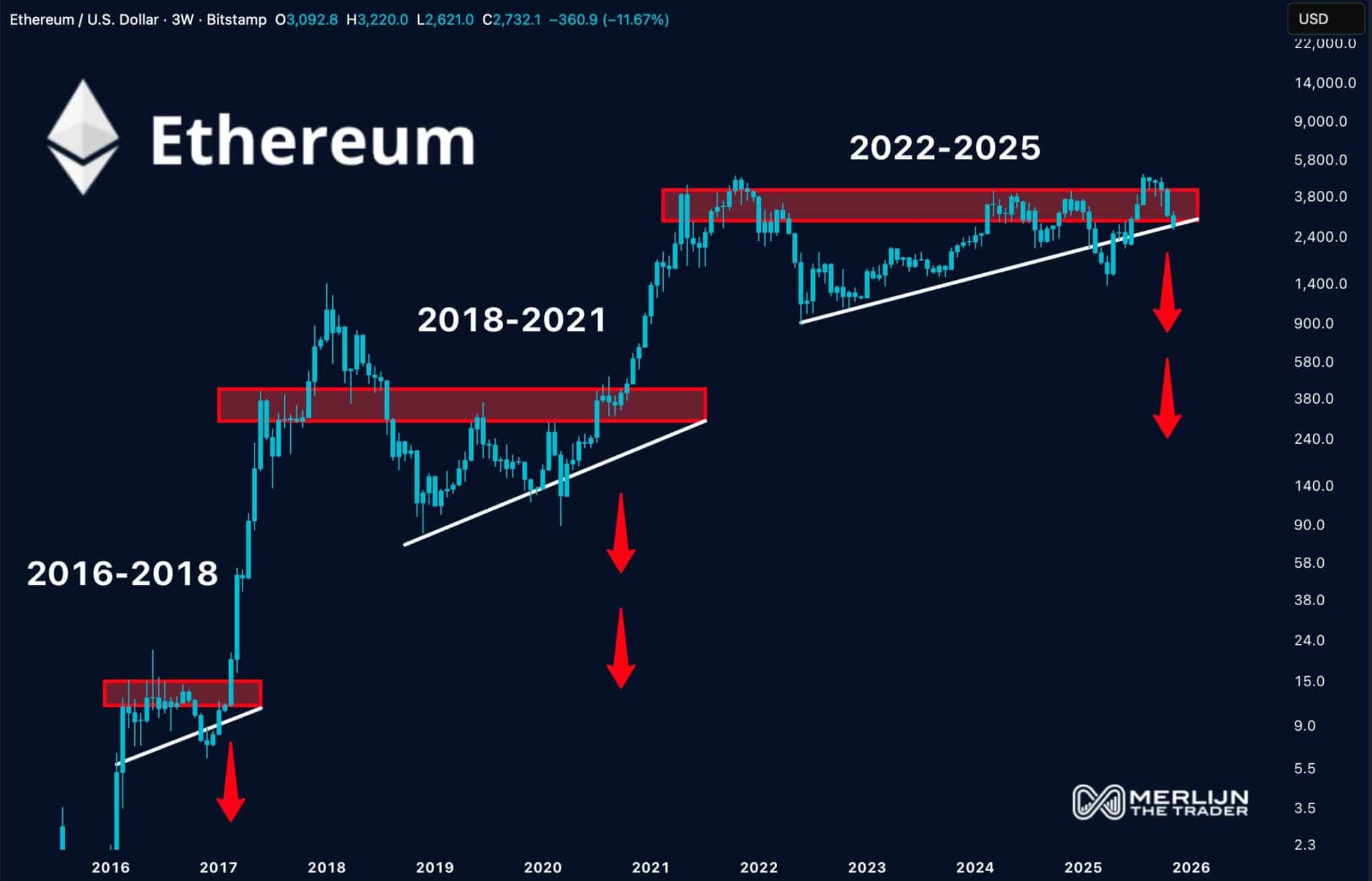 这一次,以太坊几乎没有下跌空间。从图表上看,ETH 目前正处于其最终的结构性底部,也就是支撑 2022 年至 2025 年整个价格区间的区域。