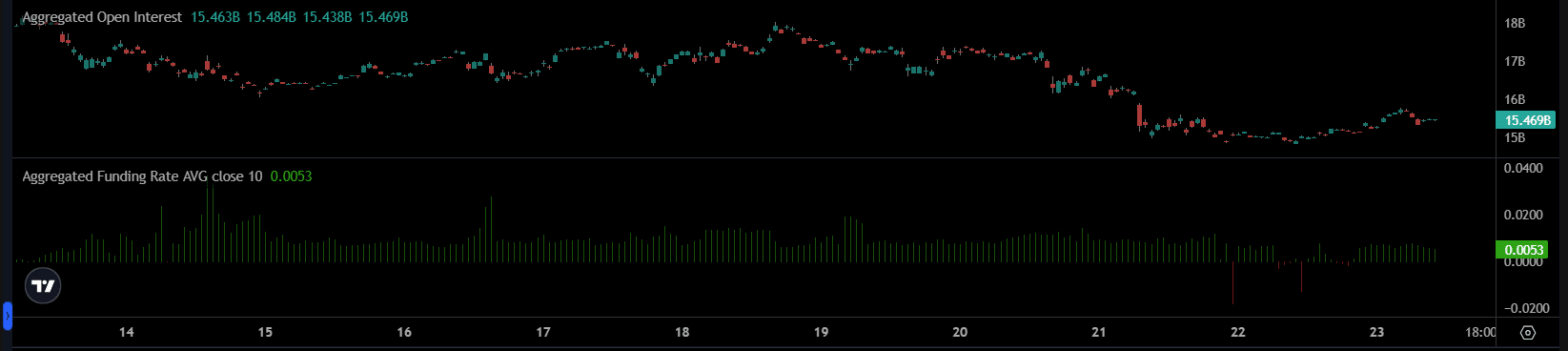 如果交易员真的感到恐慌,未平仓合约量(OI)应该会大幅下降,但事实并非如此。资金量略微为正,为0.0053,因此交易员倾向于做多,但并未过于激进。