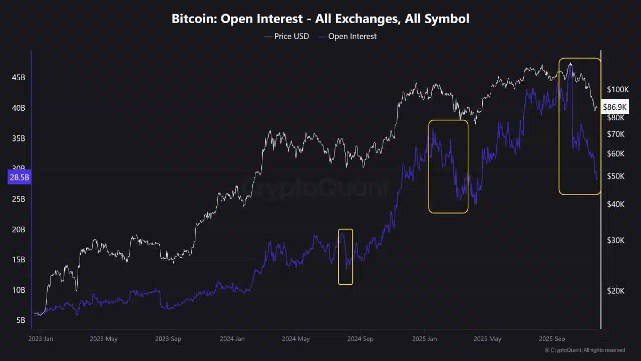 此前比特币价格暴跌的核心动因,是交易员长期过度杠杆化导致的市场失衡,而这场调整恰好完成了“健康洗牌”。据CryptoQuant数据显示,衡量市场持仓规模的未平仓合约量从450亿美元急剧降至280亿美元,本轮周期中最显著的杠杆出清就此落地。