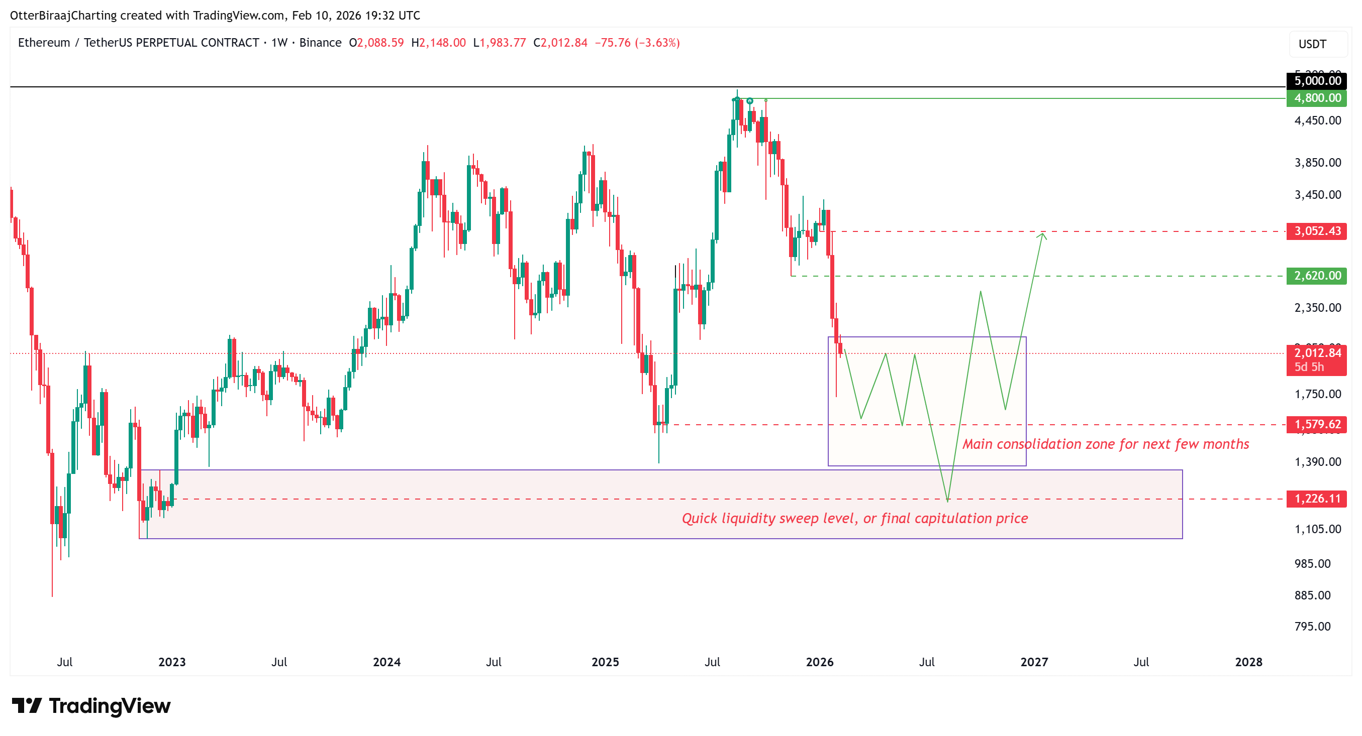 ETH近期跌至1736美元,可能只是更大横盘整理阶段中的第一个低点。