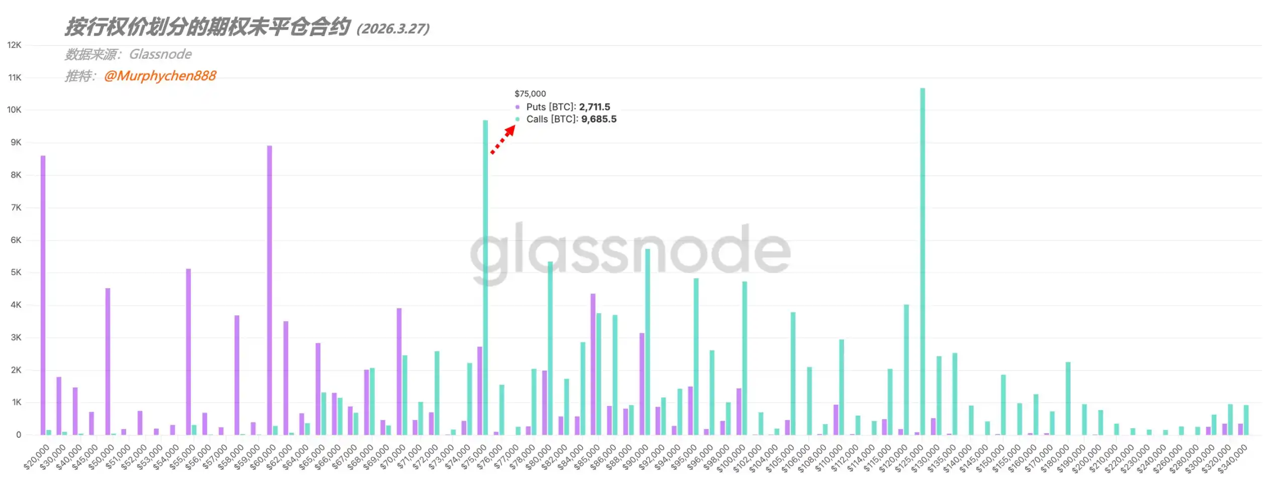 第三,期权结构正在为 75,000 美元制造磁吸效应。加密分析师 Murphy 指出,3 月 20 日到期的期权在 74,000 美元附近存在约 1.8 亿美元的 Long Gamma 敞口,做市商的对冲行为会抑制波动,使价格倾向于在该区间震荡,客观上形成阻力。