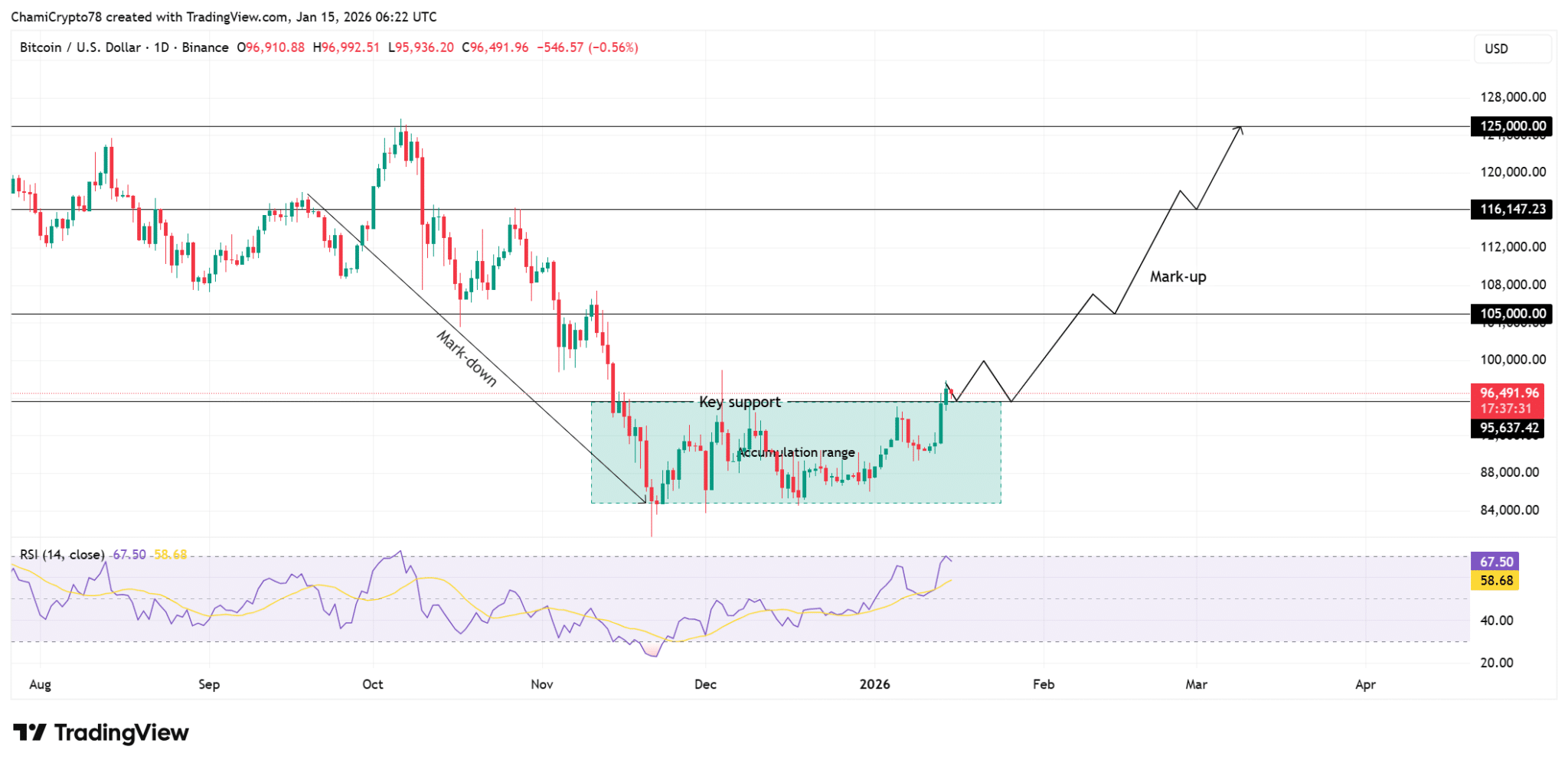 目前,比特币价格已稳步攀升至该整合区间高点上方,并在95,637美元一线确立有效接受度——这一此前的强阻力位,现已转化为关键支撑位。市场表现显示,每当价格回撤至该水平附近,便会持续吸引买盘入场,进一步强化了支撑位的角色转换。