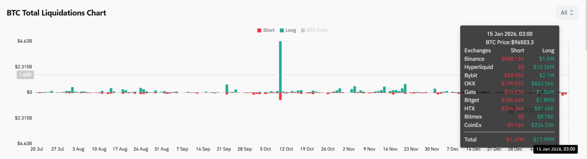清算数据显示,当前市场已完成一次有利于稳定的杠杆重置。在近期比特币价格回落过程中,多头清算规模达到约1799万美元,而空头清算规模仅为147万美元,两者呈现显著不平衡。这一数据表明,本轮清算主要由多头头寸吸收大部分强制平仓压力。