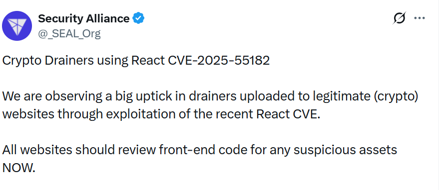 “我们观察到通过利用近期React CVE漏洞向合法加密货币网站上传盗取程序的活动大幅增加。所有网站应立即检查前端代码中是否存在可疑资源,”SEAL团队表示。