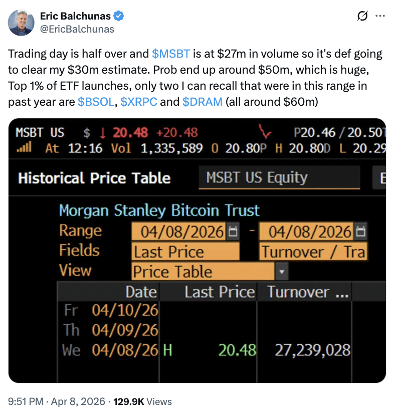 然而回溯来看,相较于其他比特币(BTC)ETF,MSBT的首发表现相对较弱。