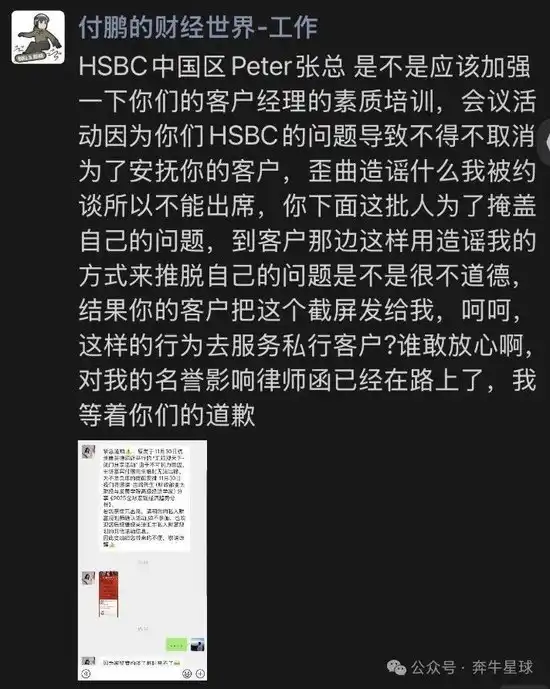 坊间出现了一个说法,称他因被监管约谈导致活动取消。付鹏公开回应,直接炮轰汇丰,晒出聊天记录,称“律师函已经在路上,等着你们的道歉"。