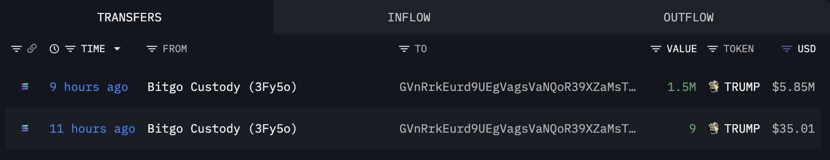 Lookonchain发布报告称,BitGo托管钱包向新创建的钱包转移了150万枚TRUMP币,价值585万美元。该地址最初发送了9枚TRUMP,很可能是测试交易以避免重大损失。