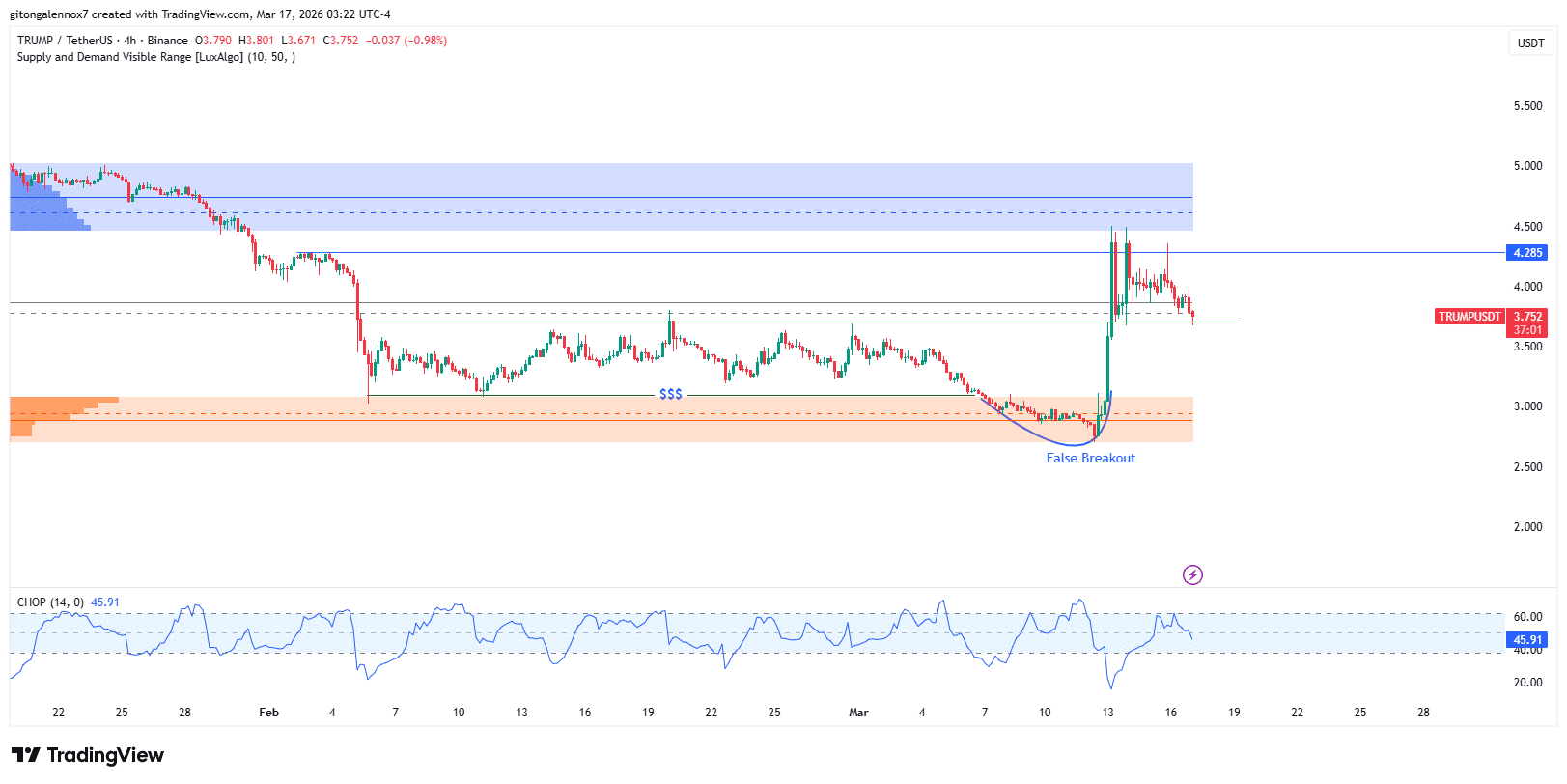 若多头继续吸筹,TRUMP可能突破该供应区。反之,若未能守住3.689美元,则该迷因币可能重新下探2.718至3美元的需求区。