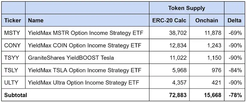 在我们识别出的 21 种数据不匹配的代币中,报告的供应量被高估了约 64,000 枚,差异高达 56%。高收益 ETF 造成的净值侵蚀约占这一差距的 90%,反向股票拆分则解释了剩余的部分。