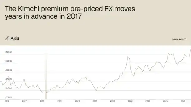 历史记录清晰地说明了这一点。早在 2017 年,当美元兑韩元汇率约为 1060 时,泡菜溢价曾达到约 40% 的峰值,这意味着有效的 USDT 兑韩元汇率约为 1480。随后在 2024 年 12 月,实际美元兑韩元汇率突破了 1480。泡菜溢价早在数年前就已提前定价了这一次外汇变动,这些信息编码在公开可见的数据中,但需要结合韩国市场资讯流才能正确解读。