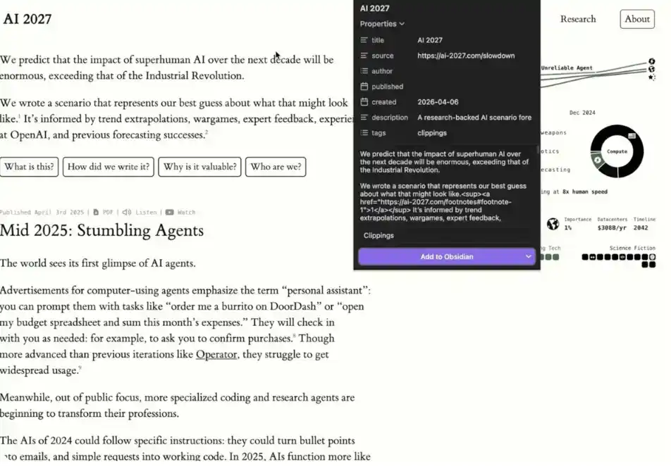 如果你想更轻松地往系统里添加数据,只需要安装 Obsidian 的 Chrome 扩展。它可以让你在浏览网页时,直接点击「Add to Obsidian(添加到 Obsidian)」,把内容一键保存进你的知识库。这会让你构建「第二大脑」的过程变得非常顺手。